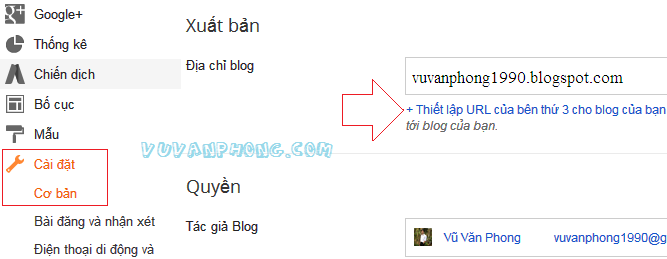 Bước 1: Vào bảng điều khiển Blogger -> Cài đặt -> Cơ bản -> Địa chỉ Blog.Bạn nhấp vào Thiết lập URL của bên thứ 3 cho blog của bạn như hình dưới đây.