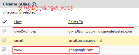 Đây là CName (Alias) đơn giản nhất. 2 dòng được khoanh đỏ tương ứng với 2 giá trị xem ở hình trên (do mình làm demo nên 2 giá trị không giống, còn các bạn copy dán sang thì nó là 1 nhé)