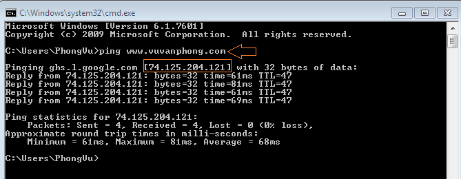 Vào lệnh CMD từ Windows để ping Domain đó. Với cú pháp