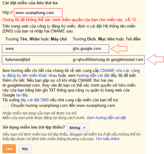 Bước 2: bạn nhập Domain của bạn và bạn bấm LƯU. Sau đó bạn gặp lỗi 12, lỗi này xảy ra khi Blogger không thể xác minh thẩm quyền của bạn cho tên miền này. Và Blogger đưa có bạn 2 Records để xác minh như hình dưới (2 mũi tên)